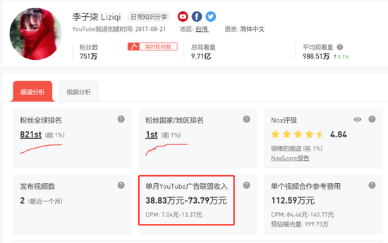 油管发视频是有广告分成的,一般千次播放量在0.6-1.4美元,直接上Influencer可以看到李子柒的收入预估。