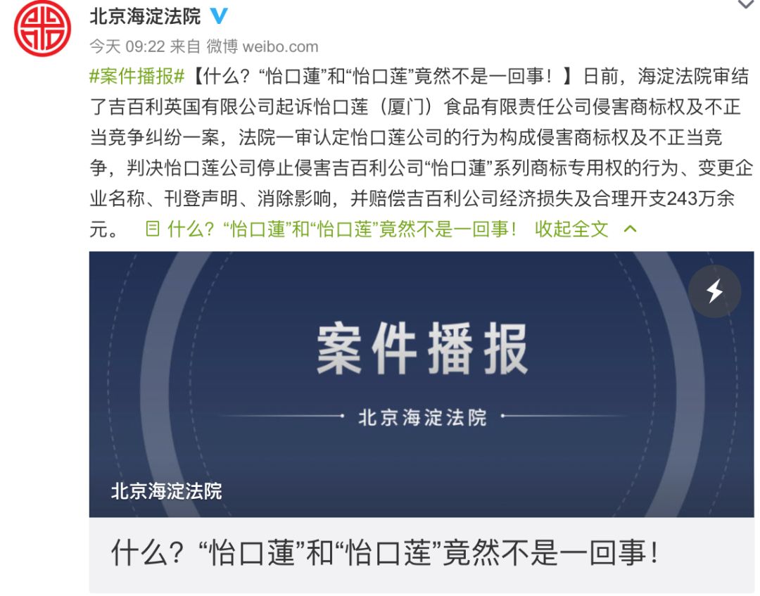 日前,北京海淀法院一审认定,怡口莲公司的行为构成侵害商标权及不正当竞争,判决怡口莲公司停止侵害吉百利公司“怡口蓮”系列商标专用权的行为、变更企业名称、刊登声明、消除影响,并赔偿吉百利公司经济损失及合理开支243万余元。
