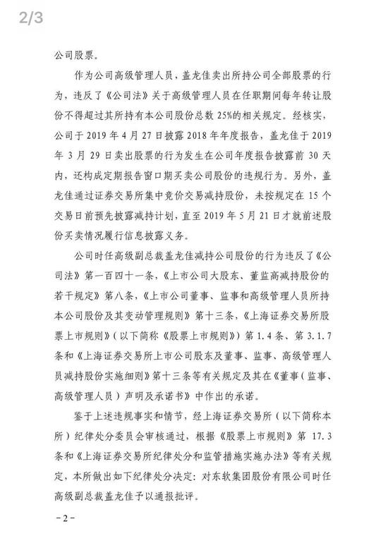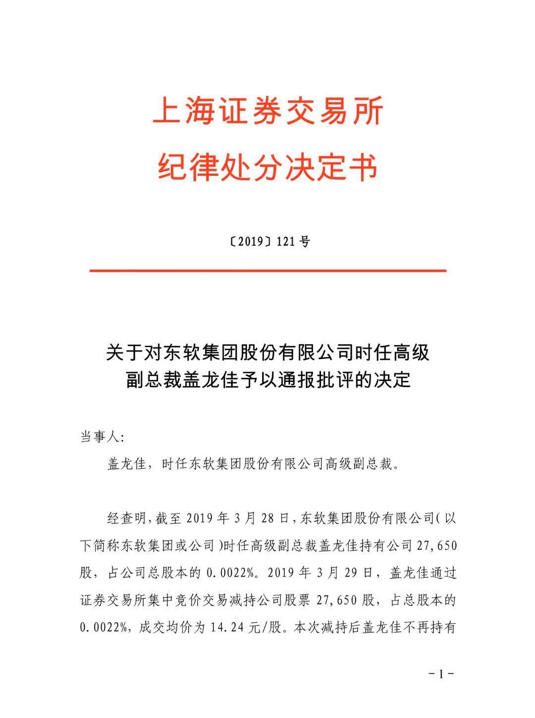 鉴于上述违规事实和情节,经上交所纪律处分委员会审核通过,根据《股票上市规则》第17.3条和《上海证券交易所纪律处分和监管措施实施办法》等有关规定,上交所做出如下纪律处分决定:对东软集团股份有限公司时任高级副总裁盖龙佳予以通报批评。对于上述纪律处分,本所将通报中国证监会,并记入上市公司诚信档案。