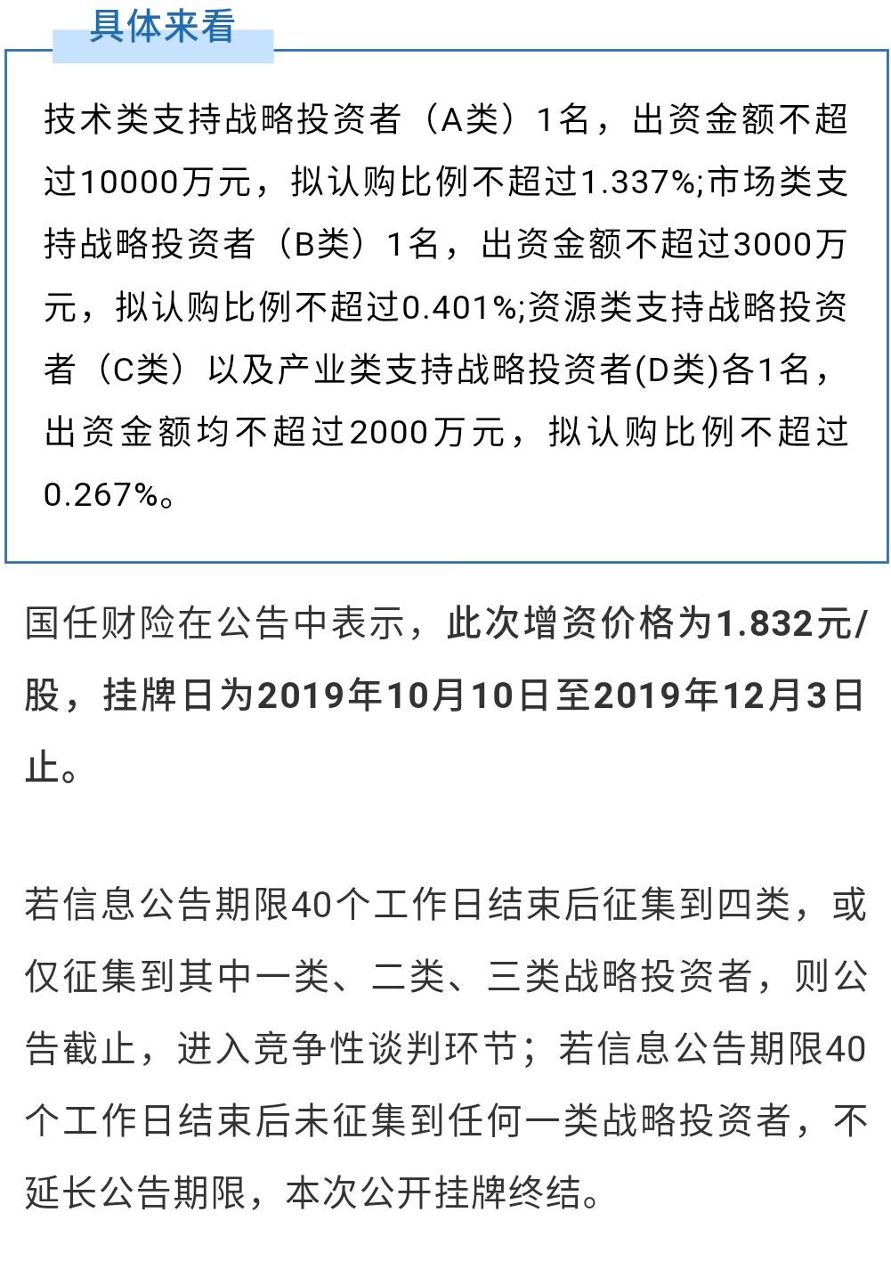 国任财险在深圳联合产权交易所发布增资扩股公告,表示拟引进5名战略投资者。其中,4名为通过公开挂牌引进的战略投资者,1名为经国资委批复同意后协议增资的战略投资者,且4名通过公开挂牌方式引入的战略投资者资质要涵盖技术类、市场类、资源类以及产业类支持类型。