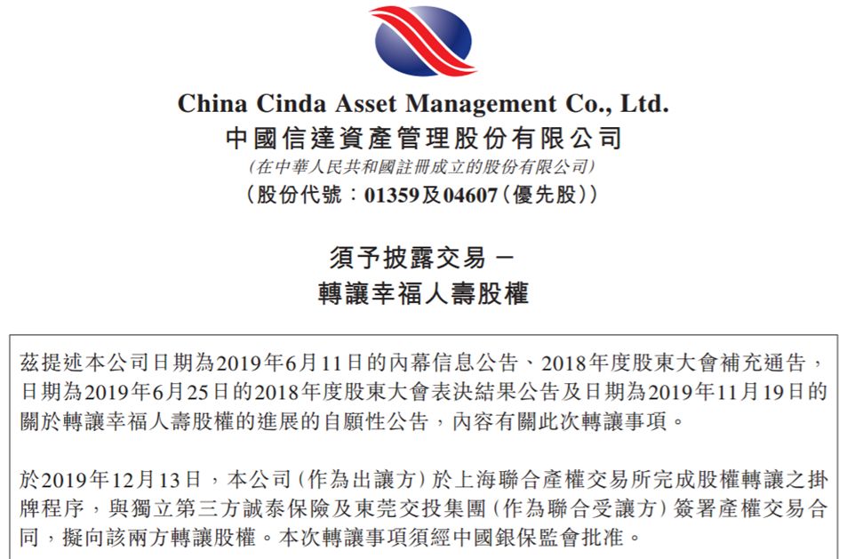 如果此次转让成功,中国信达将完全退出幸福人寿股东名单,结束与幸福人寿的12年“牵手”。