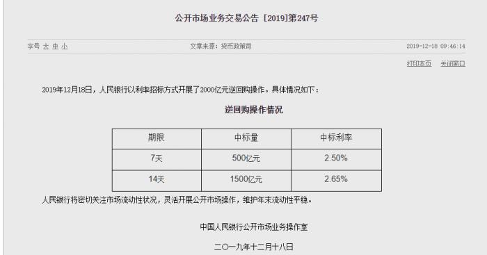 央行20个工作日后重启逆回购:投放2000亿 利率下