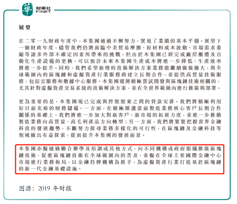 据2019年财年中展望一栏显示(如下图所示),“本集团亦拟通过联合办学及培训或其他方式,向不同机构或政府组织推广区块链技术,促进区块链技术在全球范围内的普及,并拟在全球主要国际金融中心市场进行业务布局,以金融持牌机构为抓手,为虚拟资产行业打造基于区块链的新一代金融基础设施。”说白了,火币科技想借用火币平台在区块链技术沉淀,衍生出与区块链技术相关的产品服务,聚焦数字金融产业。
