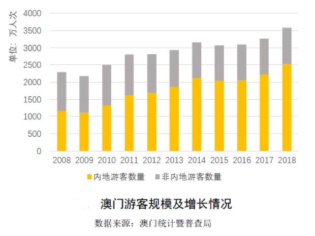 1999年,澳门游客总量为700万人次,这一数据在2018年达到3580.4万人次,实现400%的增长;2018年,澳门旅游收入达3735.7亿澳门元,同比增长13.9%。