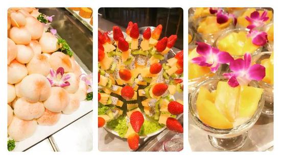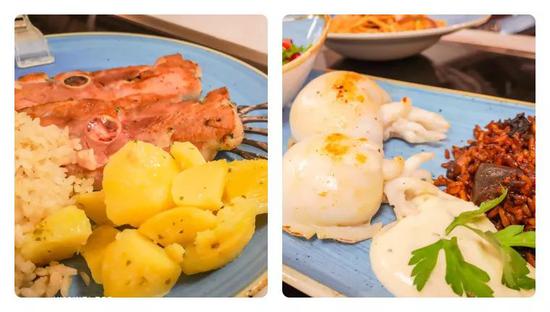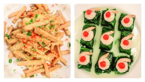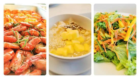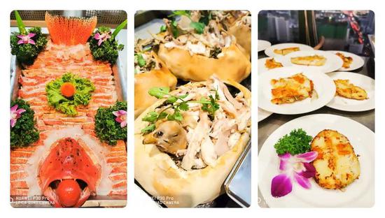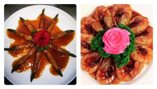 餐厅拿手菜是家常菜,反手就是8个菜:口蘑扒菜胆、金丝虾球、腊肉荷兰豆、茄汁大虾、翡翠虾球、培根芦笋、蛋黄焗山药、卤水肘花,摆盘精美,高颜值又好口味,饭后还可以来个小蛋糕,嗨森~