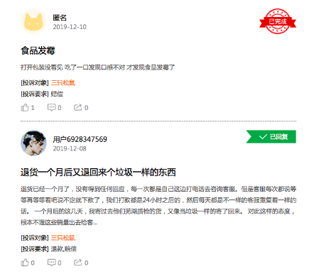 尽管今年三只松鼠实现了上市,但是产品安全问题依然突出,黑猫投诉平台上三只松鼠的投诉依然高达293件(截止12月17日),相较而言,其竞争对手的投诉约为其一半或者三分之一。《商学院》记者看到,三只松鼠主要投诉内容都是围绕食品安全,例如包装里有异物,产品发霉,事物中毒等问题,尤其是产品里有各种异物非常普遍。