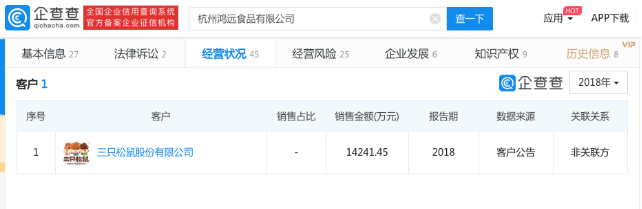 例如2016年、2017年三只松鼠的第一大供应商--杭州临安新杭派食品有限公司,成立于2015年,初始注册资本仅为300万元,2017年6月变更为2000万元;杭州鸿远食品有限公司成立于2015年,初始注册资本也是300万,同样在2017年6月变更为2000万元;2018年第一大供应商江苏鸿滨食品有限公司,采购额为3.98亿元,占到7.54%,这家公司成立于2017年7月,为自然人独资。记者从相关资料中查到杭州临安新杭派食品有限公司位于杭州130公里外的临安乡镇。