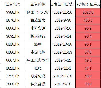 港股统计数据(数据来源:wind 截至12月17日,18日上市新股按11点涨幅统计)发现,在今年的新股集资中,阿里巴巴集资1012亿港元,成为今年港股集资王,也是港股第三大新股,仅次于友邦保险和工商银行。