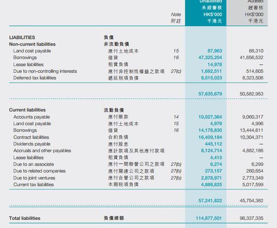 财报显示,截至2019年6月30日,合生创展的总负债为1148.78亿港元,资产负债率为62.16%,均为近10年最高水平。其中银行及财务机构借贷总额为494.59亿港元,与2018年底的数据相比增长了近40亿港元。