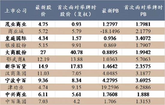 附文中涉及部分商业上市公司最新股价及估值情况与首次举牌时比较