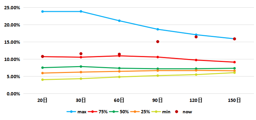 沪金价格指数历史波动率分布结合历史波动率的分布及黄金波动率锥来看,当前90日、120日、150日历史波动率略高于均值水平受当前市场行情及短时间窗口历史波动率影响,90日历史波动率未来走低概率较大。