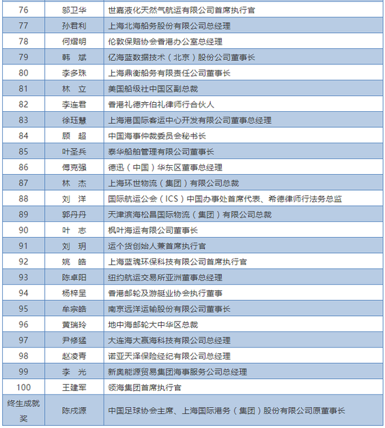 近日,由中国航运百人组委会联合航运界网共同评选的“2019年度最受航运界关注的100位中国人”榜单正式发布。中国远洋海运集团有限公司董事长许立荣荣膺榜首,中国足球协会主席、上海国际港务(集团)股份有限公司原董事长陈戌源获终身成就奖。