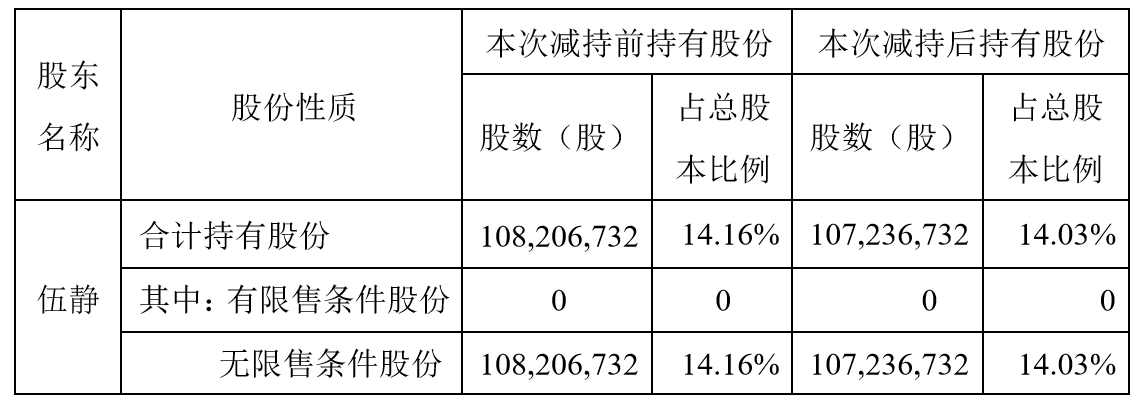 此前,伍静因个人资金需求,计划在3个月内以集中竞价交易方式减持公司股份的数量不超过611.78万股,不超过披露日当时公司总股本的0.79%。公告显示,截至12月16日,伍静共进行了六次减持,其中,11月26日,减持股数15万股,占公司总股本比例为0.02%。12月3日,减持股数14万股,占公司总股本比例为0.02%。12月4日,减持股数23万股,占公司总股本比例为0.03%。12月5日,减持股数15万股,占公司总股本比例为0.02%。12月6日,减持股数24万股,占公司总股本比例为0.03%。12月16日,减持股数6万股,占公司总股本比例为0.01%。