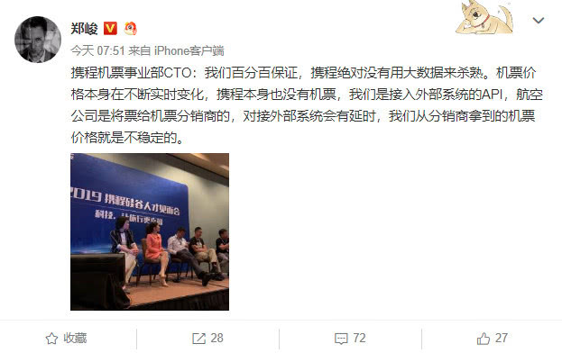 随后在今年6月,携程机票事业部CTO声称:“机票价格本身在不断实时变化,携程本身也没有机票,我们是接入外部系统的API,航空公司是将票给机票分销商的,对接外部系统会有延时,我们从分销商拿到的机票价格就是不稳定的。”
