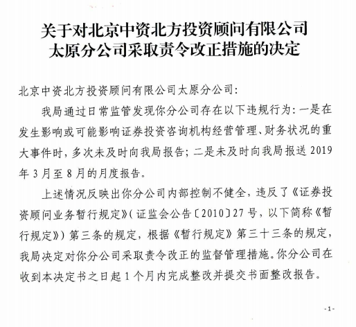 中国网财经12月25日讯 据证监会网站消息,山西监管局发布关于对北京中资北方投资顾问有限公司(以下简称中资北方)太原分公司采取责令改正措施的决定。