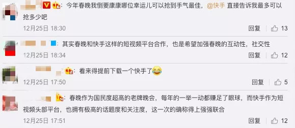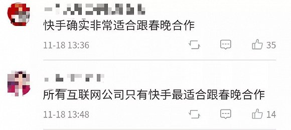 有网友看到消息后评价,“快手确实非常适合跟春晚合作”;甚至有些评价更为直接,“所有互联网公司只有快手最适合跟春晚合作”。