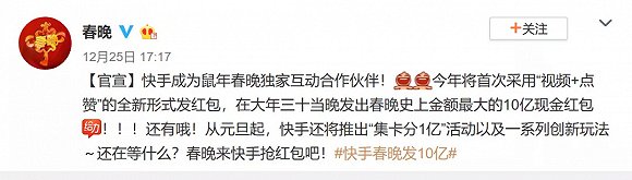 12月25日,春晚在微博上“官宣”快手成为鼠年春晚独家互动合作伙伴: