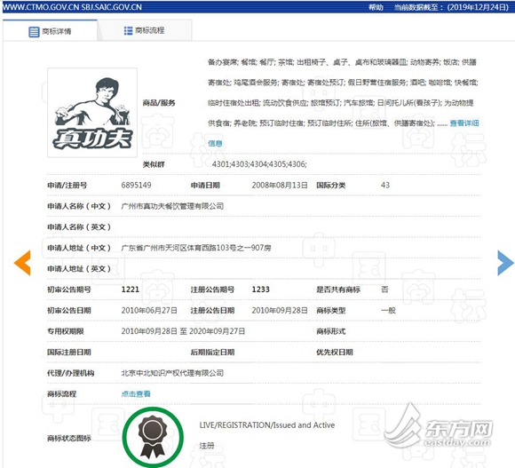 东方网记者通过查询中国商标网发现,近年来,真功夫餐饮陆续获得了10余个真功夫系列注册商标,涵盖餐馆、餐厅、饭店、化妆用具、清洁制剂、虫害防治、日间托儿所等多种品类。