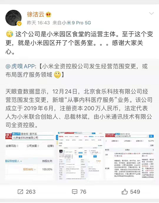 12月25日,虎嗅微博发布约20分钟后,小米集团公关部总经理徐洁云发微博,称北京食乐科技有限公司是小米园区食堂的运营主体,新增内科医疗服务业务的变更就是小米园区开了个医务室。徐洁云并在微博中@了之前报道小米新增相关业务的虎嗅APP。小米公关部总经理的回复似乎是对小米疑似进军医疗服务领域猜测的否认。 徐洁云微博具体内容如下: