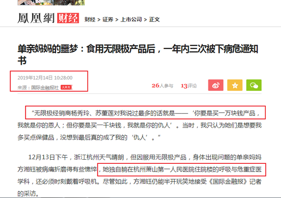 12月14日的国际金融报道说:因服用无限极产品,身体出现问题的单亲妈妈方湘钰被病痛折磨得有些憔悴,她独自躺在杭州萧山第一人民医院住院楼的呼吸与危重症医学科,还必须时刻戴着呼吸机。尽管如此,方湘钰仍能半开玩笑地接受《国际金融报》记者的采访。