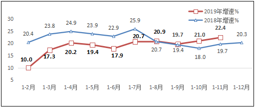 互联网业务收入加快增长。1-11月,我国规模以上2互联网和相关服务企业(简称互联网企业)完成业务收入10886亿元,同比增长22.4%,增速同比提高2.7个百分点,比1-10月增速提高1.4个百分点。