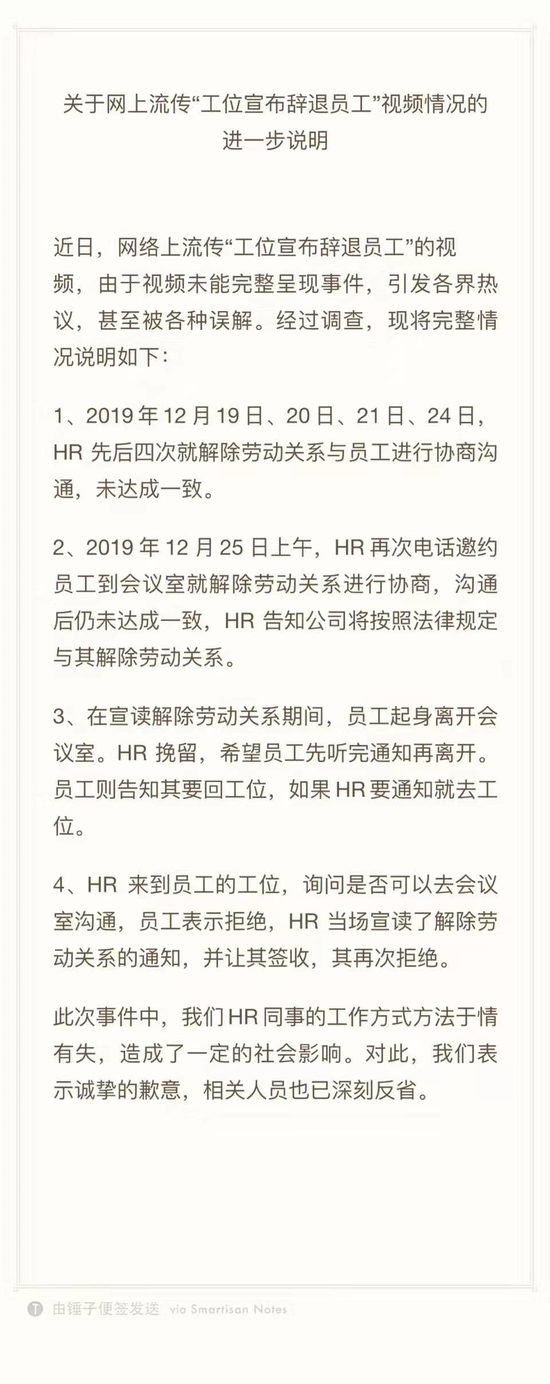 关于网上流传“工位宣布辞退员工”视频情况的进一步说明
