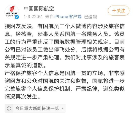 通报称,接网友反映,有国航员工个人微博内容涉及旅客信息。经核查,涉事人员系国航一名乘务人员。该员工的行为严重违反了国航数据管理相关规定。目前公司已对该员工作出停飞处分,后续将根据公司有关规定进一步严肃处理。对此事涉及的旅客表示最真诚的道歉。