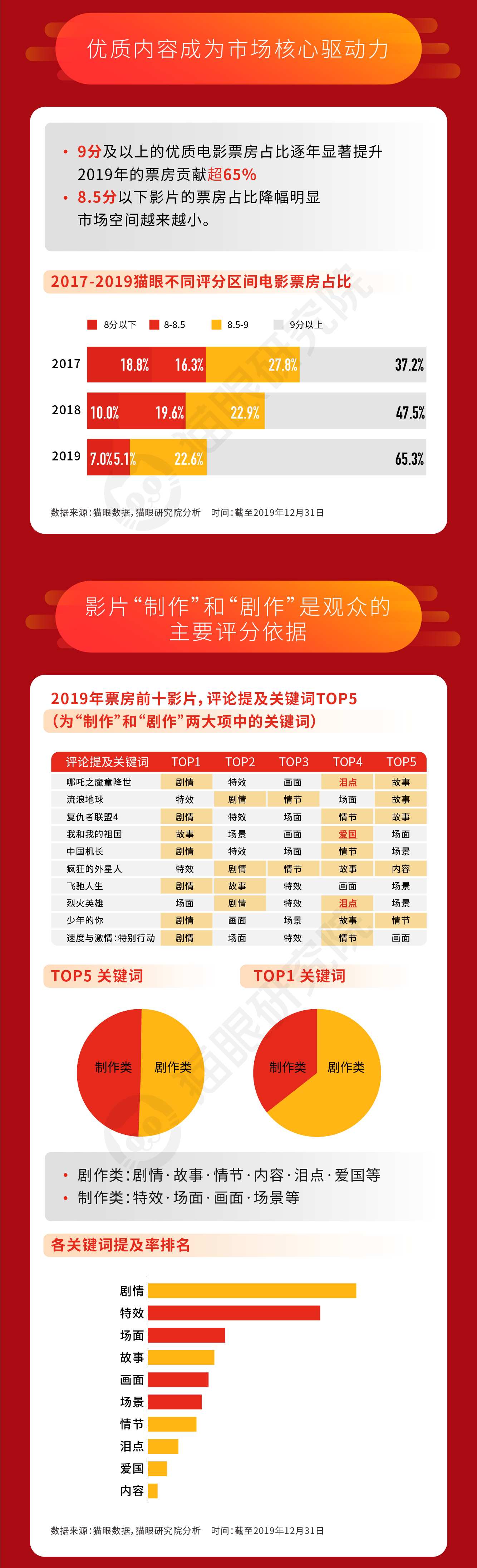 优质内容成为市场核心驱动力。2019年高分电影在电影票房上,展示出了更强的“吸金”能力。其中,9分以上电影占据了65.3%的票房,影片质量成为观众“投票”的主要决定因素。