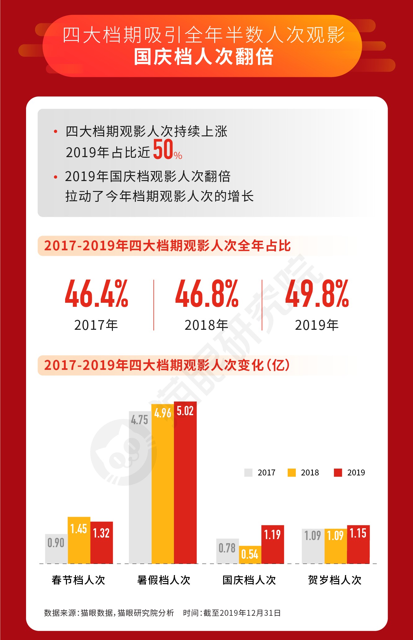 这一年,主旋律电影也迎来爆发,从8月的《烈火英雄》,到9月的《决胜时刻》,再到国庆《我和我的祖国》《中国机长》《攀登者》三部重量级献礼步步递进,真正实现了主旋律电影市场化的完美转型,最终2019年国庆档实现观影人次翻倍,迎来史上“最强国庆档”。