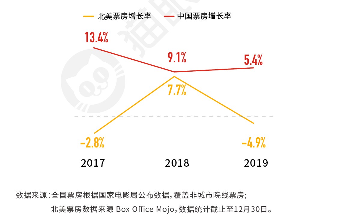 《2019年中国电影市场数据洞察报告》显示,北美2019年票房再次回到负增长,尽管中国票房增速较上一年有所放缓,但中美票房之间的差距仍在不断缩小。