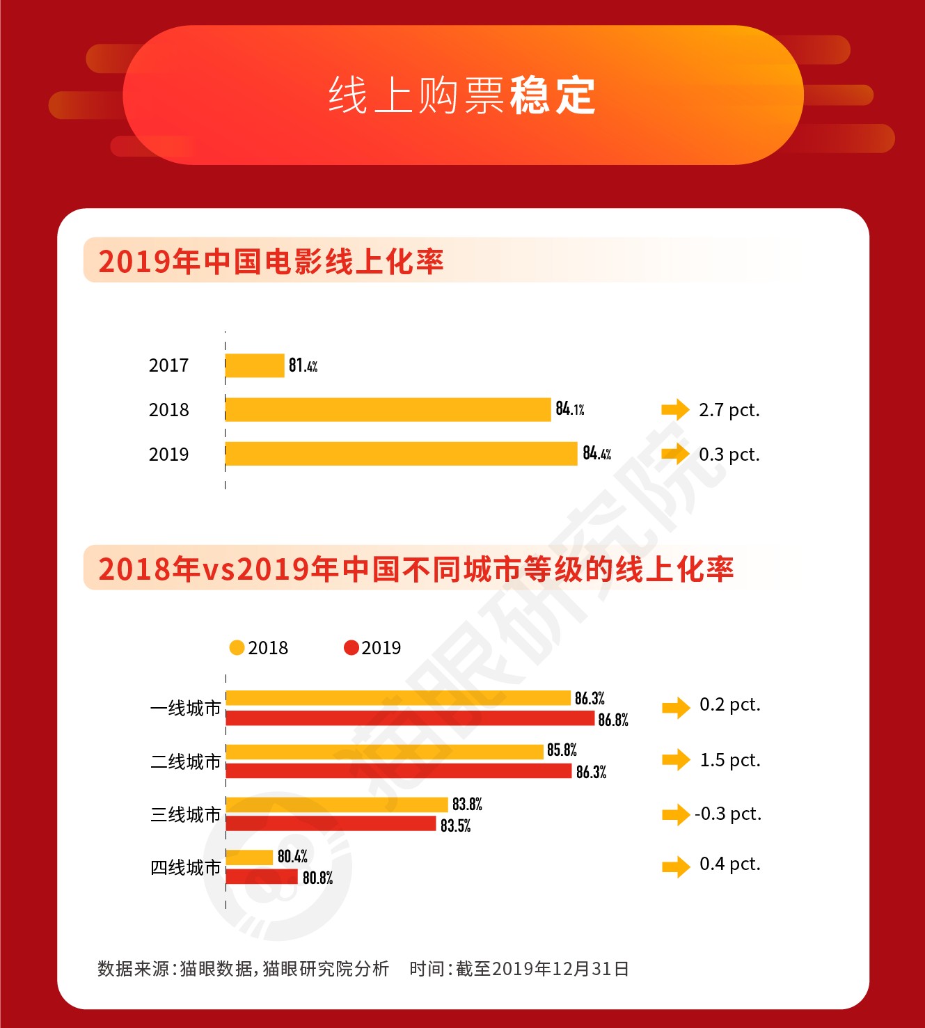 智通财经APP了解到,2019年电影市场线上化率保持稳定,整体达到84.4%水平。除三线城市外,所有层级线上化率均有所提高。猫眼娱乐作为占据六成市场份额的线上电影票务平台龙头,在异业合作、联合营销方面,也凭借互联网基因走在了电影行业的前列。