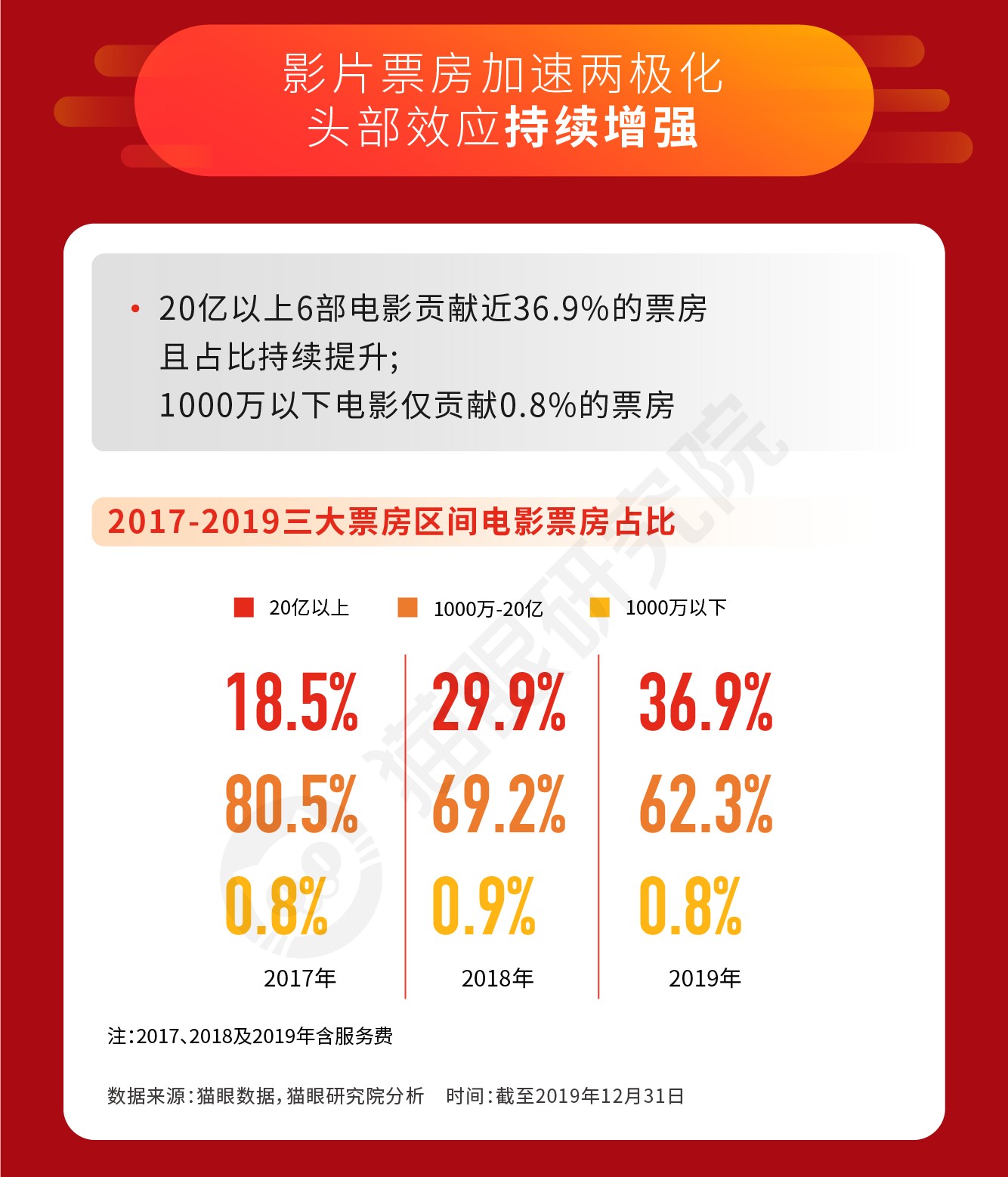 2019年,中国电影票房头部效应进一步增强。其中,6部20亿以上电影贡献了近36.9%的票房。“二八法则”在行业中被淋漓尽致地体现,其中,1000万以下的电影票房仅占比0.8%。