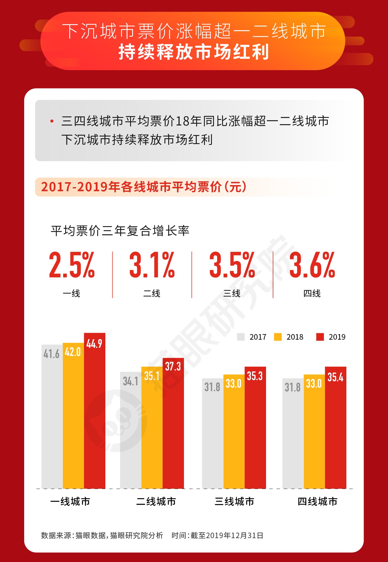 在低线市场中,三四线城市的平均票价涨幅超过一二线城市,下沉市场红利持续释放。其中,四线城市逐渐养成平时观影习惯,2017 - 2019年间,非档期票房中四线城市占比逐年实现22.1%、23.9%、24.4%比重的提升快速。其中,四线城市平均票价也实现了最快增长,三年复合增长率达3.6%。