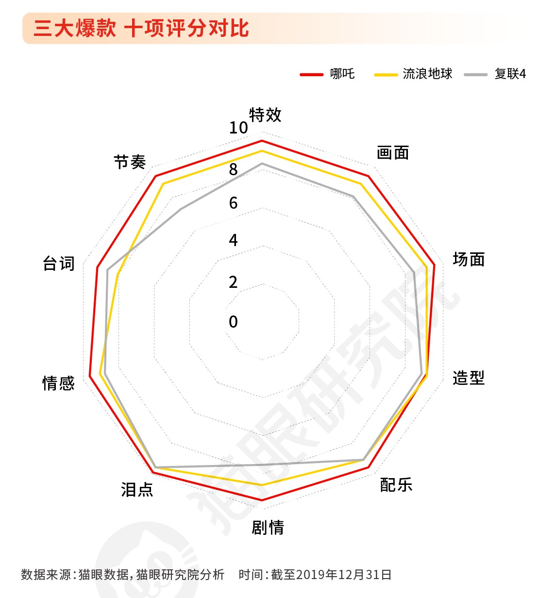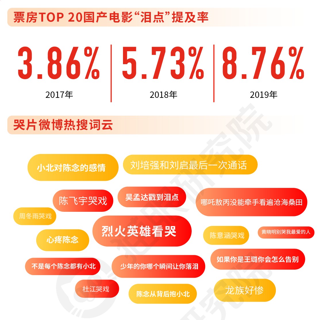 2019年,“泪点”成为电影市场的主题词。猫眼发布的《2019年中国电影市场数据洞察报告》显示,票房TOP20国产电影中,“泪点”提及率达到8.76%,较2018年提升3.03个百分点。三大爆款电影中,泪点也成为了最集中特征。