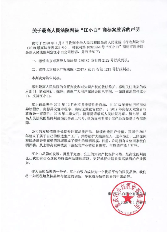 我司于2020年1月3日收到中华人民共和国最高人民法院《行政判决书》(2019最高法行再224号),对我司第10325554号“江小白”商标审理终结,最高人民法院判定江小白公司胜诉,并判决如下: