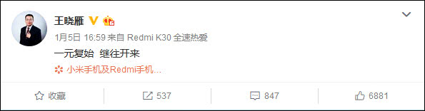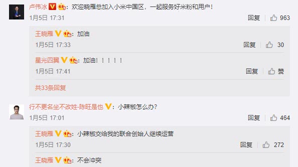 除此之外,今年1月4日,小米集团宣布,小辣椒创始人王晓雁正式加入小米。昨日下午(1月5日),王晓雁也在微博官宣自己加盟小米一事并表示:“一元复始,继往开来”。