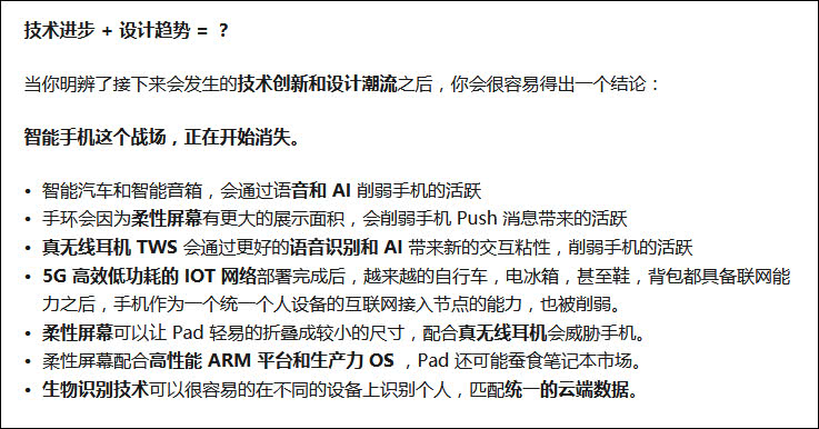 李楠还列举了诸多理由:智能汽车和智能音箱,会通过语音和AI削弱手机的活跃;手环会因为柔性屏幕有更大的展示面积,削弱手机Push消息带来的活跃;真无线耳机TWS会通过更好的语音识别和AI带来新的交互粘性,削弱手机的活跃等等。