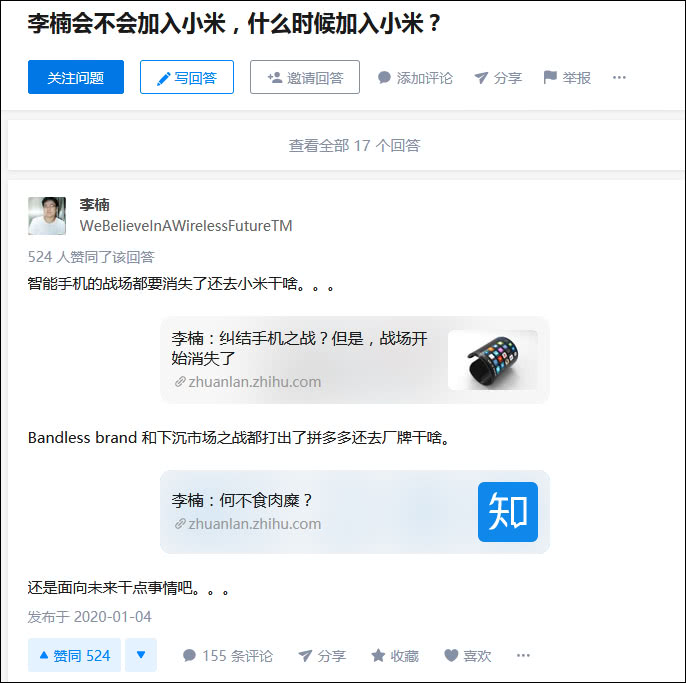 日前,有网友在社交平台上提问,“原魅族科技CMO兼公司高级副总裁李楠会不会加入小米,什么时候加入小米?”对此,李楠本人回应称:“智能手机的战场都要消失了还去小米干啥。”