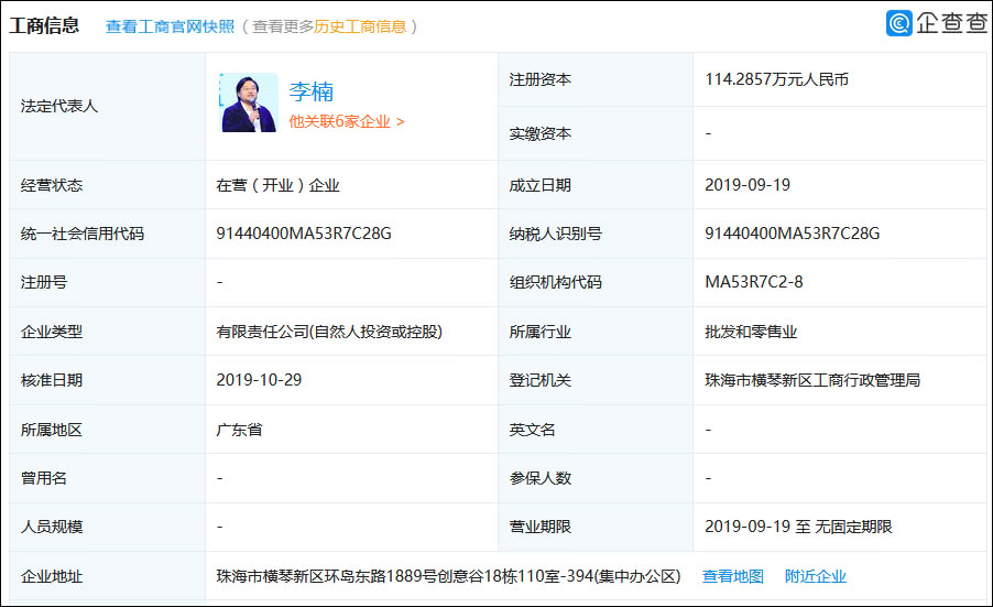企查查信息显示,离开魅族的李楠成立了一家名为“珠海市怒喵科技有限公司”的科技公司。该公司成立于2019年9月19日,注册资本114.286万元人民币,主要经营范围包括网络科技、信息科技、网络工程领域内的技术转让、玩具等。
