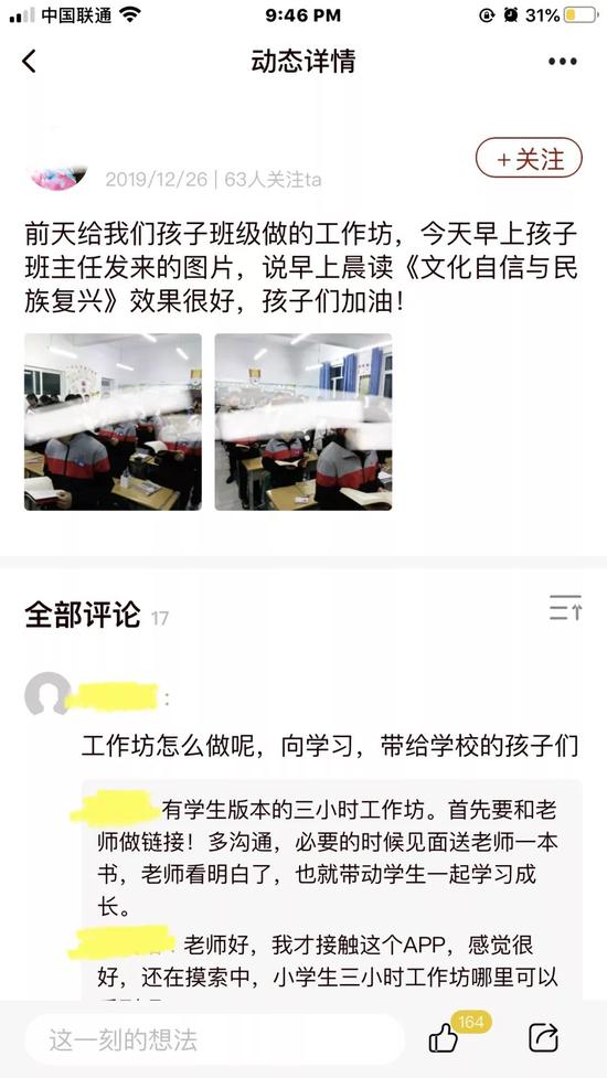 此外,“致良知四合院”的影响已渗透到初高中和幼儿园。记者了解到,河北省隆尧县的一位幼儿园园长,邀请学生家长参加“致良知四合院”系列工作坊,并组织在微信群中每日早读诵“小红书”。一位初三学生家长在“四合院”APP分享称,向孩子所在班级推广“致良知”后,班级晨读时曾集体诵读“致良知四合院”出版的《文化自信与民族复兴》。