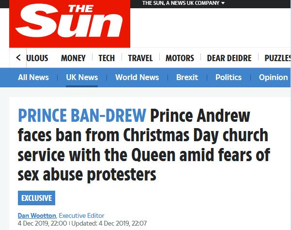[环球网报道 记者 温家越]因卷入美国富豪爱泼斯坦“性侵少女”丑闻,英国安德鲁王子深陷舆论漩涡。英国《太阳报》4日爆料称,考虑到今年圣诞节可能会出现由关注性侵案件活动人士所组织的抗议,安德鲁王子当天可能被禁止出现在教堂,参加女王主持的圣诞节仪式。