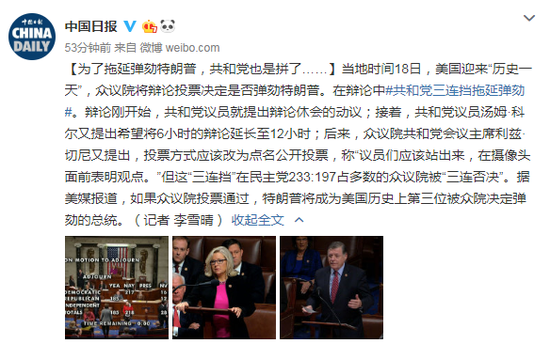 当地时间18日,美国迎来“历史一天”,众议院将辩论投票决定是否弹劾特朗普。在辩论中#共和党三连挡拖延弹劾#。辩论刚开始,共和党议员就提出辩论休会的动议;接着,共和党议员汤姆·科尔又提出希望将6小时的辩论延长至12小时;后来,众议院共和党会议主席利兹·切尼又提出,投票方式应该改为点名公开投票,称“议员们应该站出来,在摄像头面前表明观点。”但这“三连挡”在民主党233:197占多数的众议院被“三连否决”。据美媒报道,如果众议院投票通过,特朗普将成为美国历史上第三位被众院决定弹劾的总统。(记者 李雪晴)