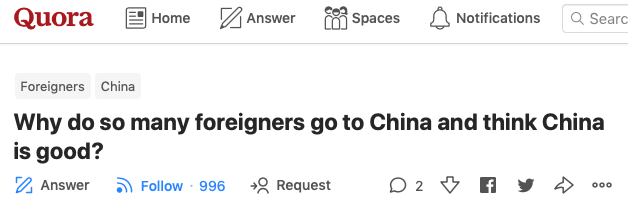 近些年,中国的快速发展吸引了更多外国人来到中国,了解中国。其中不乏像@萌叔大卫老师这样爱上中国,甚至在回到本国之后经历逆向文化冲击(reverse culture shock)的。其实,类似的话题在外网的讨论度也十分高。因为各种各样的原因,一些外国人对中国还是带有些许偏见。但依旧还是有不少人希望看到真实的中国,于是就有外国网友在美版知乎Quora上提问,“为什么有那么多的外国人来中国并且认为中国是很好的?”和“为什么有那么多的人喜欢中国?”接下来我们就来看看外国人为什么喜欢中国吧。