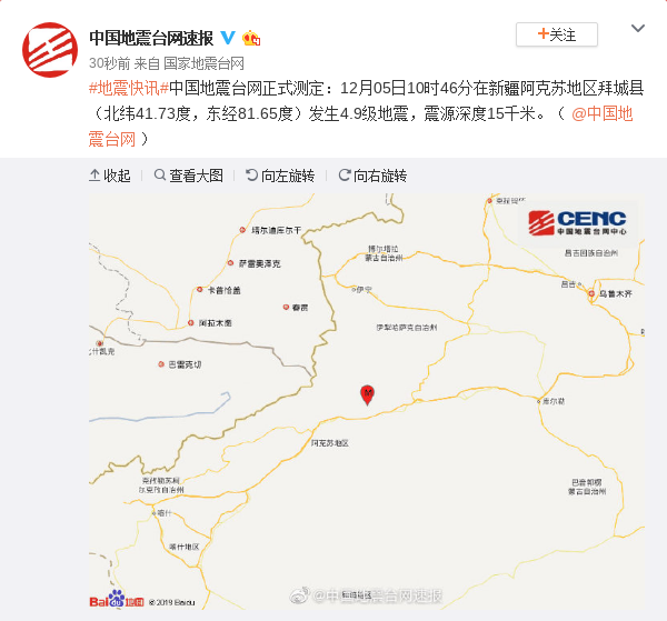 中国地震台网正式测定:12月05日10时46分在新疆阿克苏地区拜城县(北纬41.73度,东经81.65度)发生4.9级地震,震源深度15千米。( @中国地震台网 )