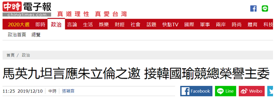 “中时电子报”报道称,马英九10日上午到国民党北市第五选区(中正、万华)“立委”参选人林郁方竞选总部,被问及9日是否应国民党2020候选人韩国瑜竞选总部主委朱立伦之邀,担任韩国瑜竞选总部荣誉主委?马英九表示,“是的,朱立伦希望我来帮忙”,马英九还称,不管有没有这头衔,他都会全力帮忙韩国瑜与“立委”参选人,会跑到最后一天。