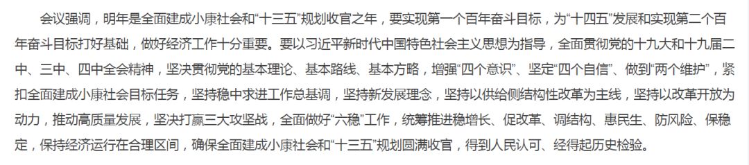从宏观而言,明年是非常关键的一年。既是全面建成小康社会和“十三五”规划收官之年,要实现第一个百年奋斗目标,还为“十四五”发展和实现第二个百年奋斗目标打好基础。