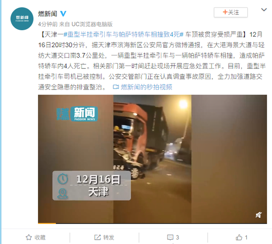 【天津一#重型半挂牵引车与帕萨特轿车相撞致4死# 车顶被贯穿受损严重】12月16日20时30分许,据天津市滨海新区公安局官方微博通报,在大港海景大道与轻纺大道交口南3.7公里处,一辆重型半挂牵引车与一辆帕萨特轿车相撞,造成帕萨特轿车内4人死亡。相关部门第一时间赶赴现场开展应急处置工作。目前,重型半挂牵引车司机已被控制。公安交管部门正在认真调查事故原因,全力加强道路交通安全隐患的排查整治。