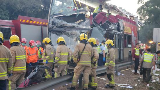 报道称,现场所见,巴士左边车身严重撞毁,消防及警方正在现场救出伤者,目前仍有两名伤者被困。部分伤者坐在地上等待救援。另外,现场设置临时停尸间。