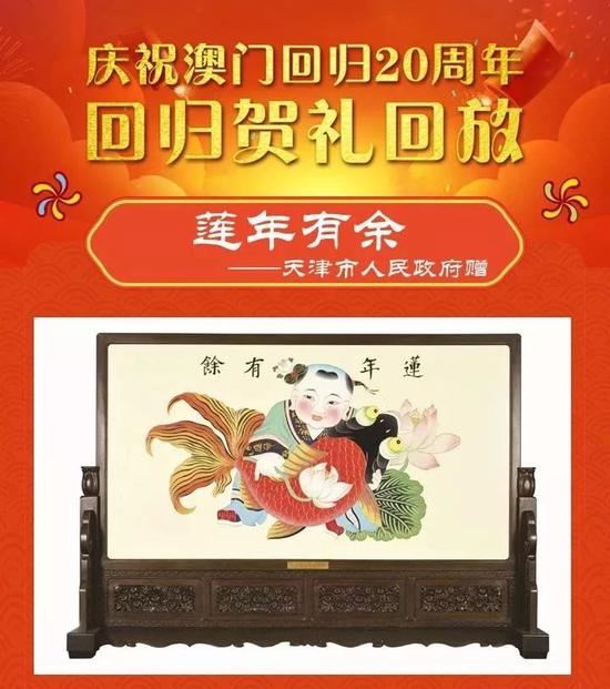 天津市人民政府赠送的回归贺礼是象征着澳门与天津永结莲心的《莲年有余》。这是一座大型的迎屏,画面采取24K镀金铜丝镶嵌漆画工艺,取材于天津杨柳青年画经典作品,具有浓郁的地方特色。
