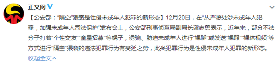 12月20日,在“从严惩处涉未成年人犯罪,加强未成年人司法保护”发布会上,公安部刑事侦查局副局长龚志勇表示,近年来,部分不法分子打着“个性交友”“童星招募”等幌子,诱骗、胁迫未成年人进行“裸聊”或发送“裸照”“裸体视频”等方式进行“隔空”猥亵的违法犯罪行为有蔓延之势,此类犯罪行为是性侵未成年人犯罪的新形态。